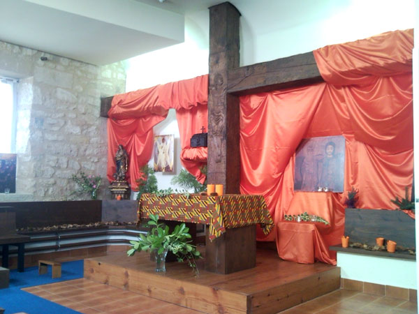 La capilla de la tercera planta se acondicionó para el evento. Iconos y fotos hacían de ese espacio un lugar de referencia para la escucha interior y el compartir con las mujeres y hombres de nuestro tiempo. Lugar de oración y contemplación, pero también espacio de escucha silenciosa. Yunque interior.